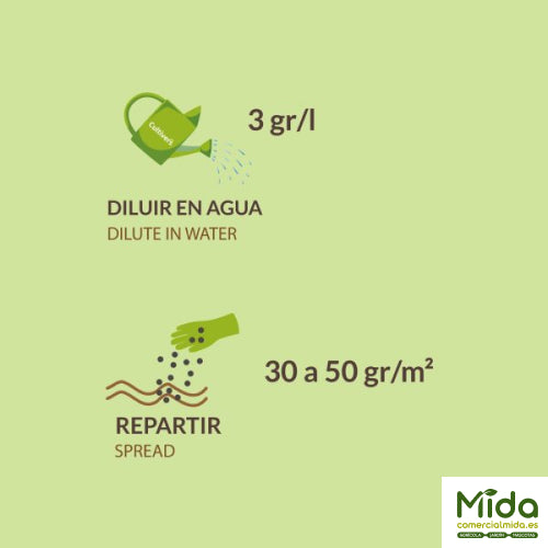 Repartir en superficie: 30 a 50 g/m², y regar después para facilitar su incorporación.