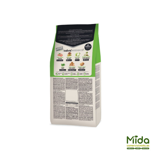 Carni 37% (Carni Disidratate 27%, Pollo Fresco* 10%), Grano Integrale* (19%), Grasso Di Pollo, Mais Integrale* (8%), Piselli Integrali* (7%), Orzo Integrale* (5%) , riso integrale* (5%), proteine del mais, lievito di birra* (1,5%), polpa di barbabietola, proteine di pollo idrolizzate, pesce disidratato, mela fresca* (1%), olio di salmone, estratto di malto, fruttosio e mannano-oligosaccaridi, botanica erbe aromatiche 0,02% (finocchio*, fiori di camomilla*, anice verde*), yucca schidigera.