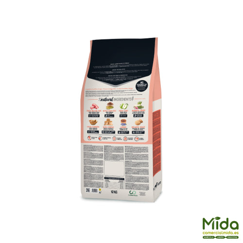 Cerdo ibérico 38% (deshidratado 28%, fresco 10% mín. antes de la extrusión), maíz entero 19%, trigo integral 17%, arroz integral 8%, manteca (con antioxidantes naturales), pulpa de remolacha, manzana 1%, semilla de lino 1%, aceite de salmón (con antioxidantes naturales), levadura de cerveza 0,5%, fructo y manano oligosacáridos, plantas aromáticas 0,02% (hinojo, equinácea, tomillo), yucca schidigera.