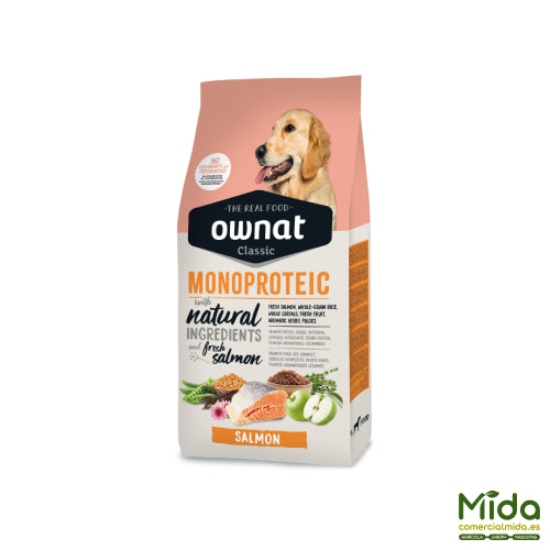 OWNAT Classic Monoproteico Salmon es un pienso seco completo para perros, formulado con ingredientes naturales de máxima calidad. Su receta monoproteica utiliza salmón como única fuente de proteína animal, siendo una alternativa excelente para perros con alergias o sensibilidades alimentarias. Incorpora 10% de salmón fresco, lo que aporta proteínas de mayor valor biológico, mejor digestibilidad y una alta palatabilidad. Combina fuentes de carbohidratos como arroz integral y otros ingredientes seleccionados para favorecer una buena tolerancia digestiva. Está elaborado sin conservantes ni colorantes artificiales, empleando antioxidantes naturales.