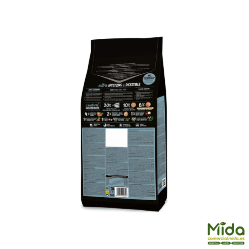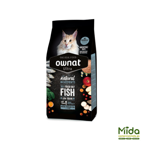 OWNAT Ultra Mature Sterilized Fish es un alimento completo y equilibrado para gatos esterilizados a partir de los 7 años, con un nivel de actividad moderado o bajo y paladar exigente. Su receta incorpora 30% de pescado azul fresco y huevo, aportando proteínas de alta calidad y una elevada palatabilidad. Presenta un alto contenido de fibra, con efecto saciante, que ayuda al control del peso y favorece una buena salud intestinal. Además, mantiene un perfil mineral controlado orientado al soporte del sistema renal en la etapa madura. Es una fórmula Low Grain, elaborada con bajos porcentajes de cereales integrales y cocción al vapor (Soft Cooking) para preservar nutrientes y sabor.